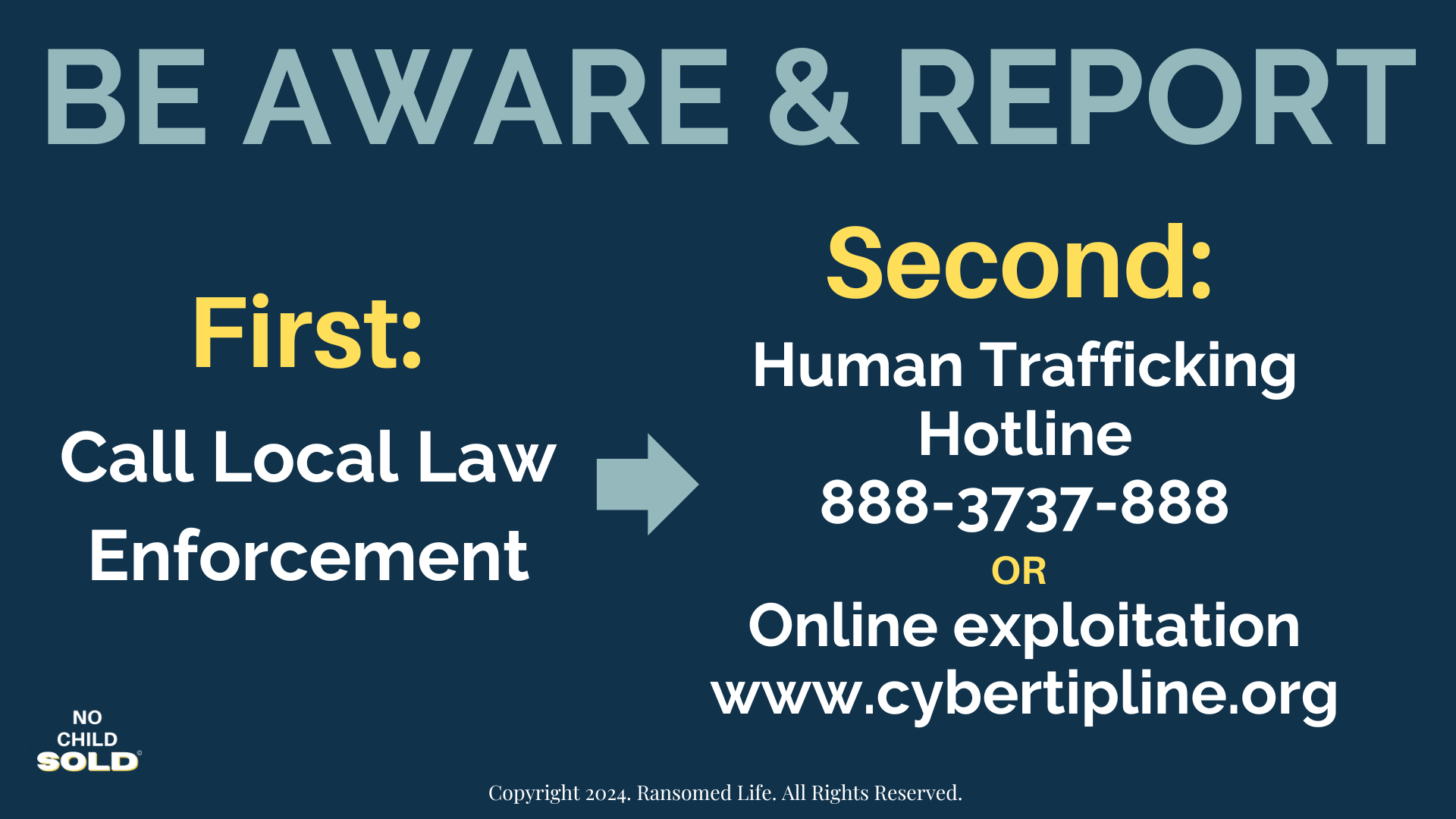 3.) After reporting to local law enforcement, call the National Human Trafficking Hotline to report any in-person tips.